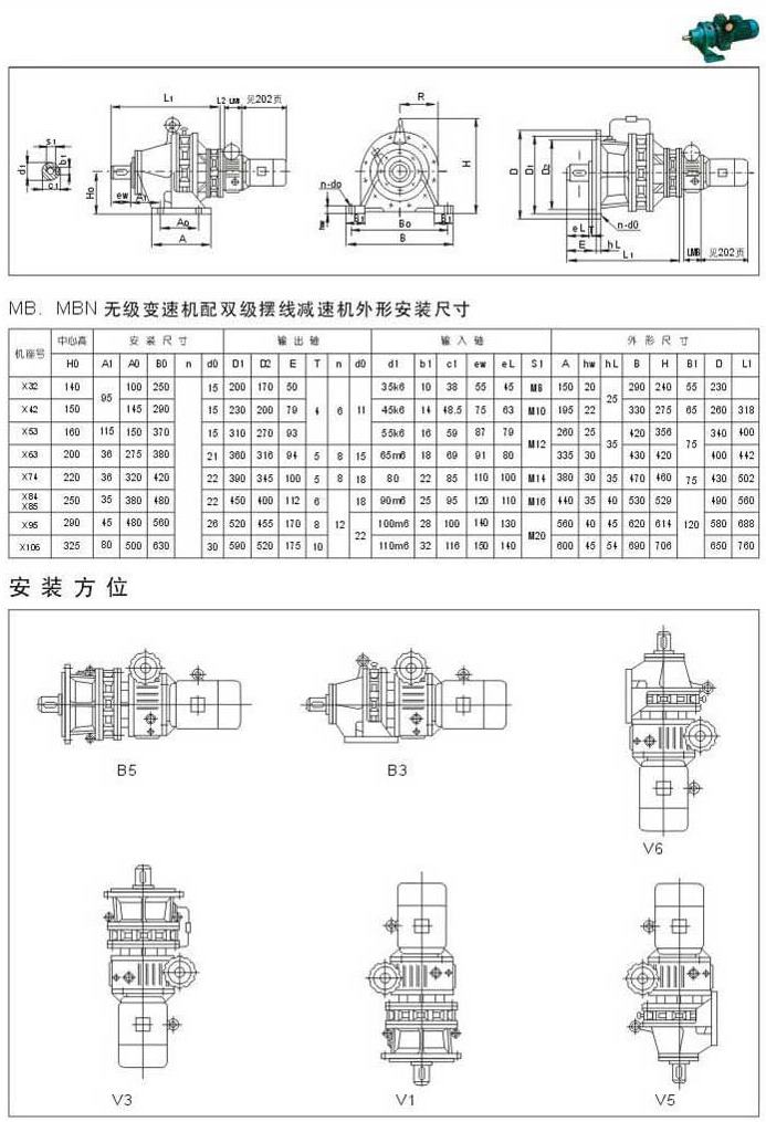 MB.MBN無級(jí)變速機(jī)配雙級(jí)擺線減速機(jī)外型安裝尺寸安裝方位